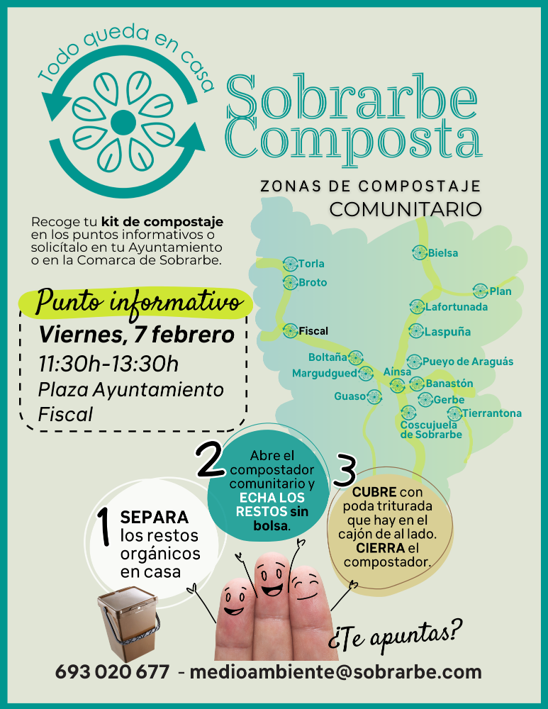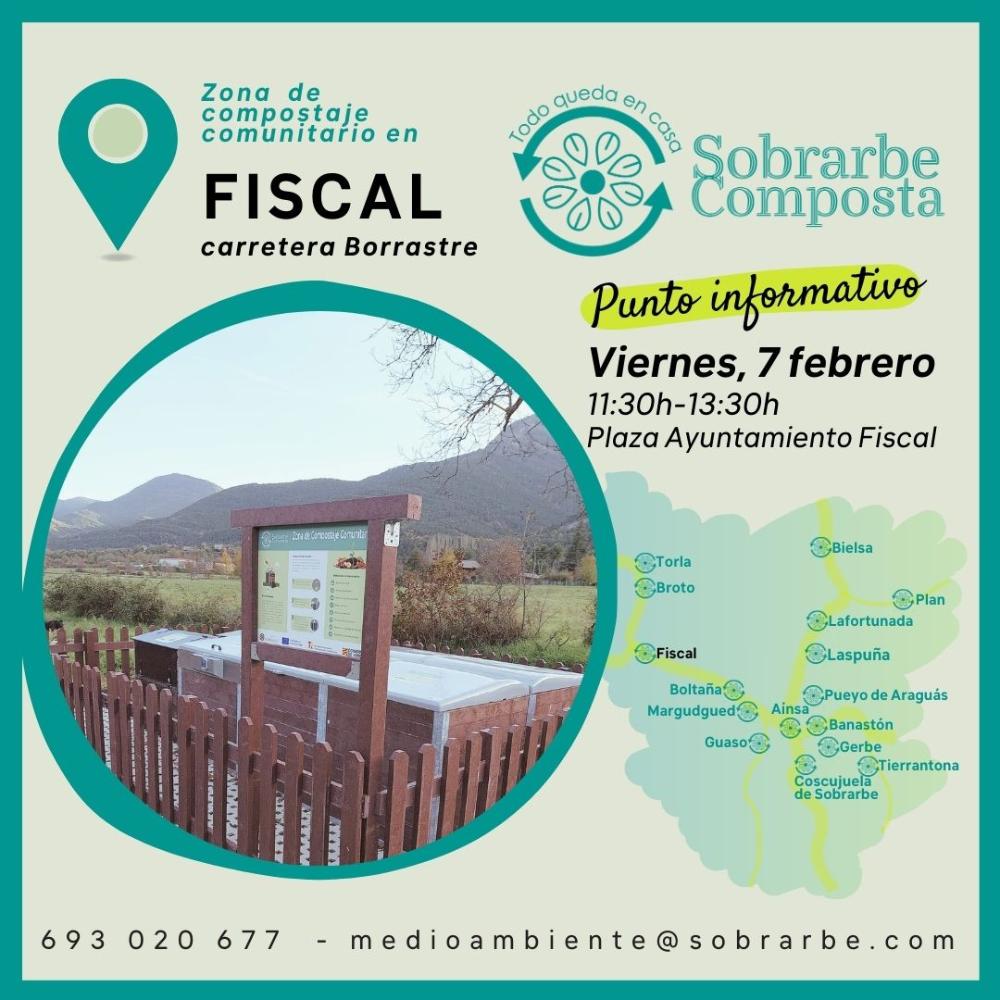 El viernes 7 de febrero se ubicará entre 11:30 y 13:30 h en la Plaza del Ayuntamiento de Fiscal un punto informativo y entrega de un kit de compostaje para las personas que lo deseen.